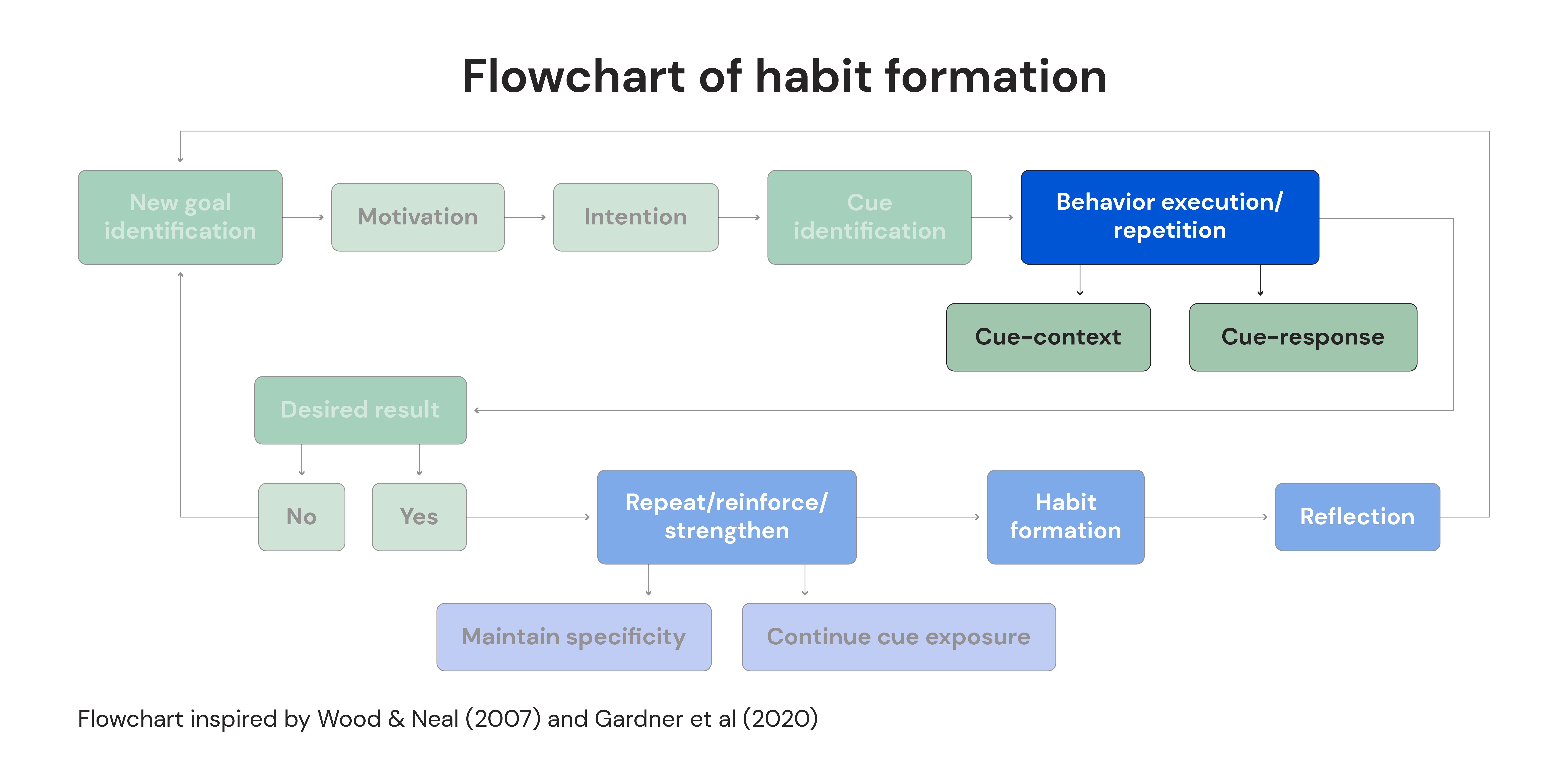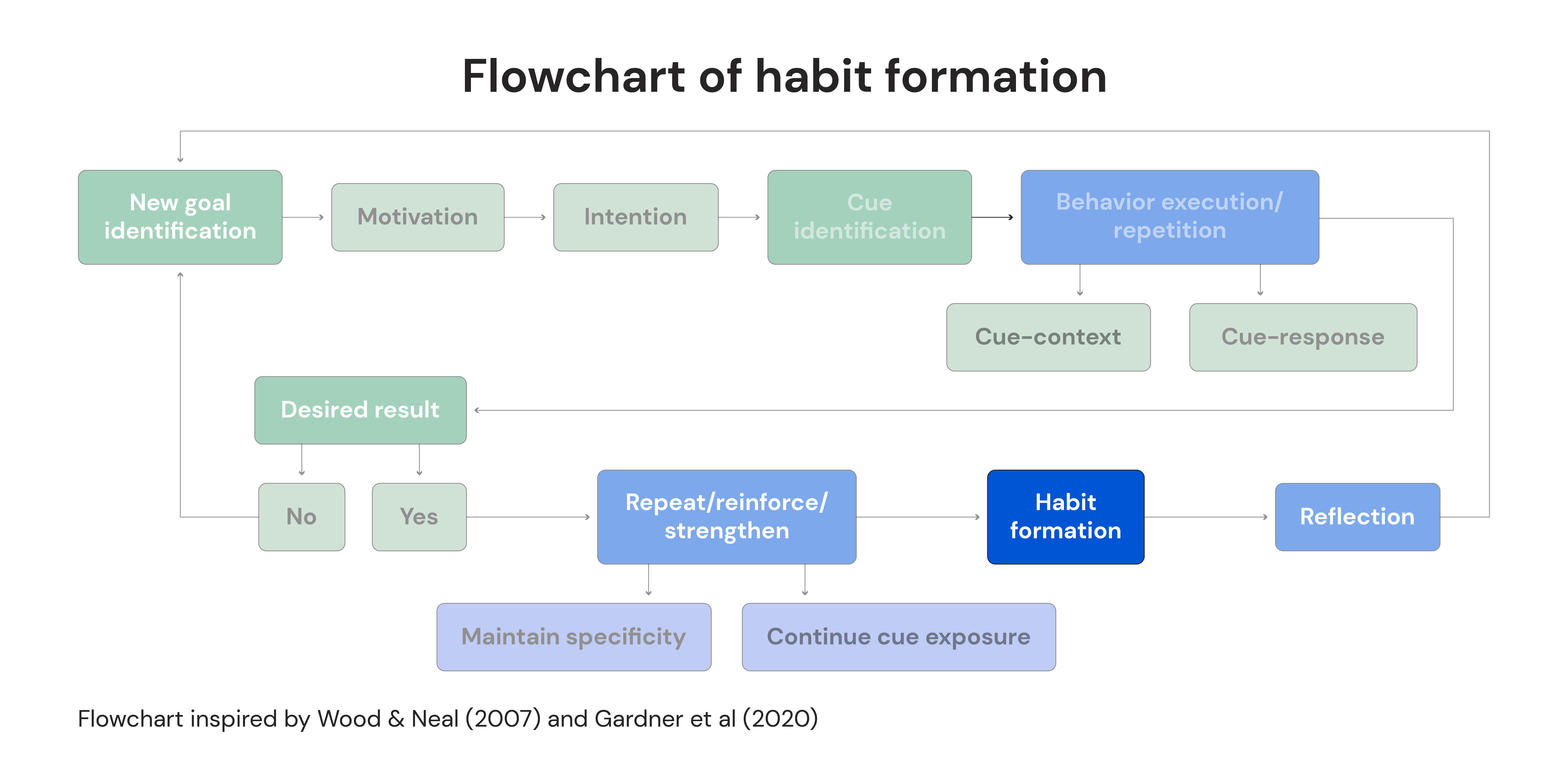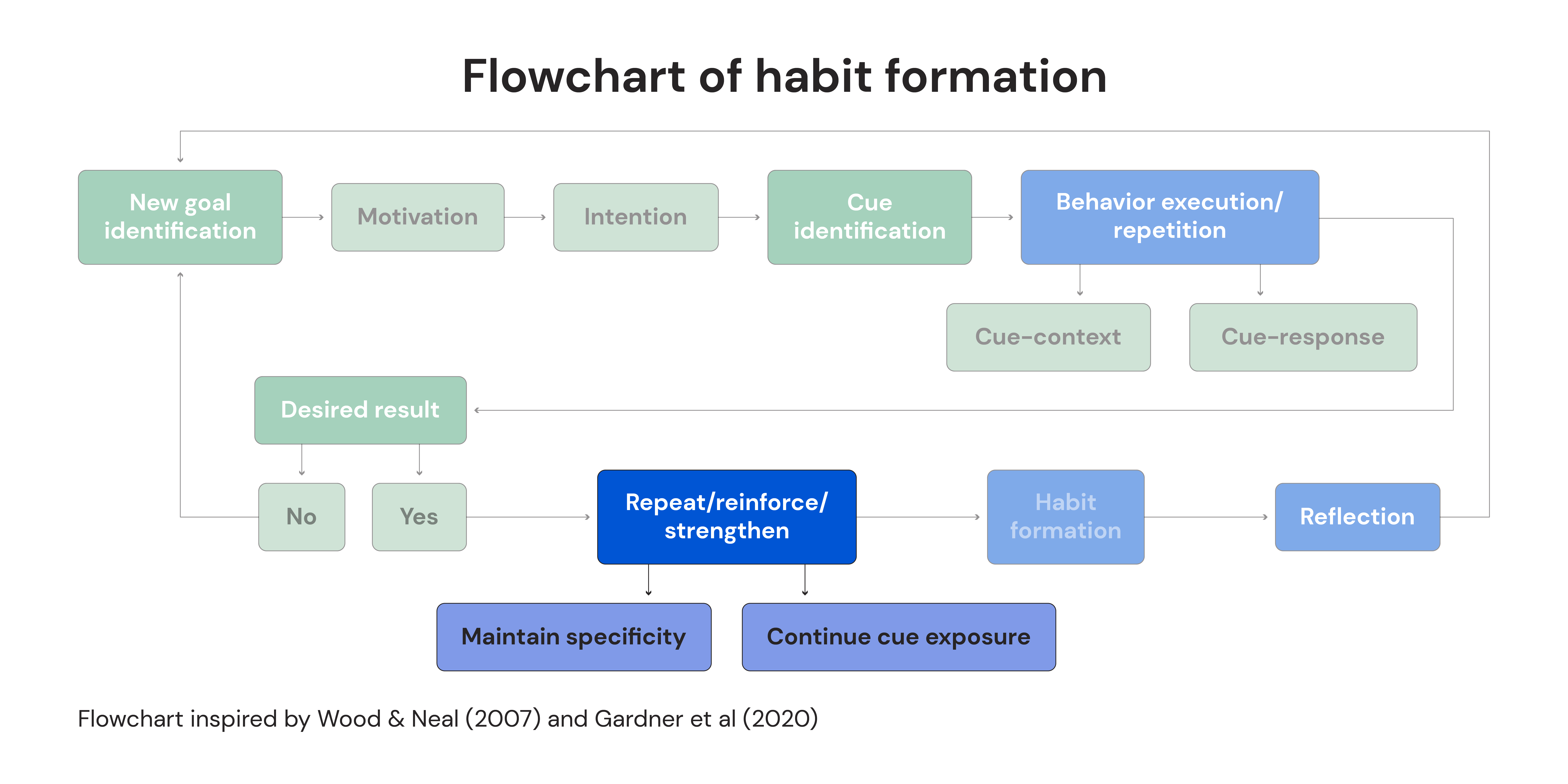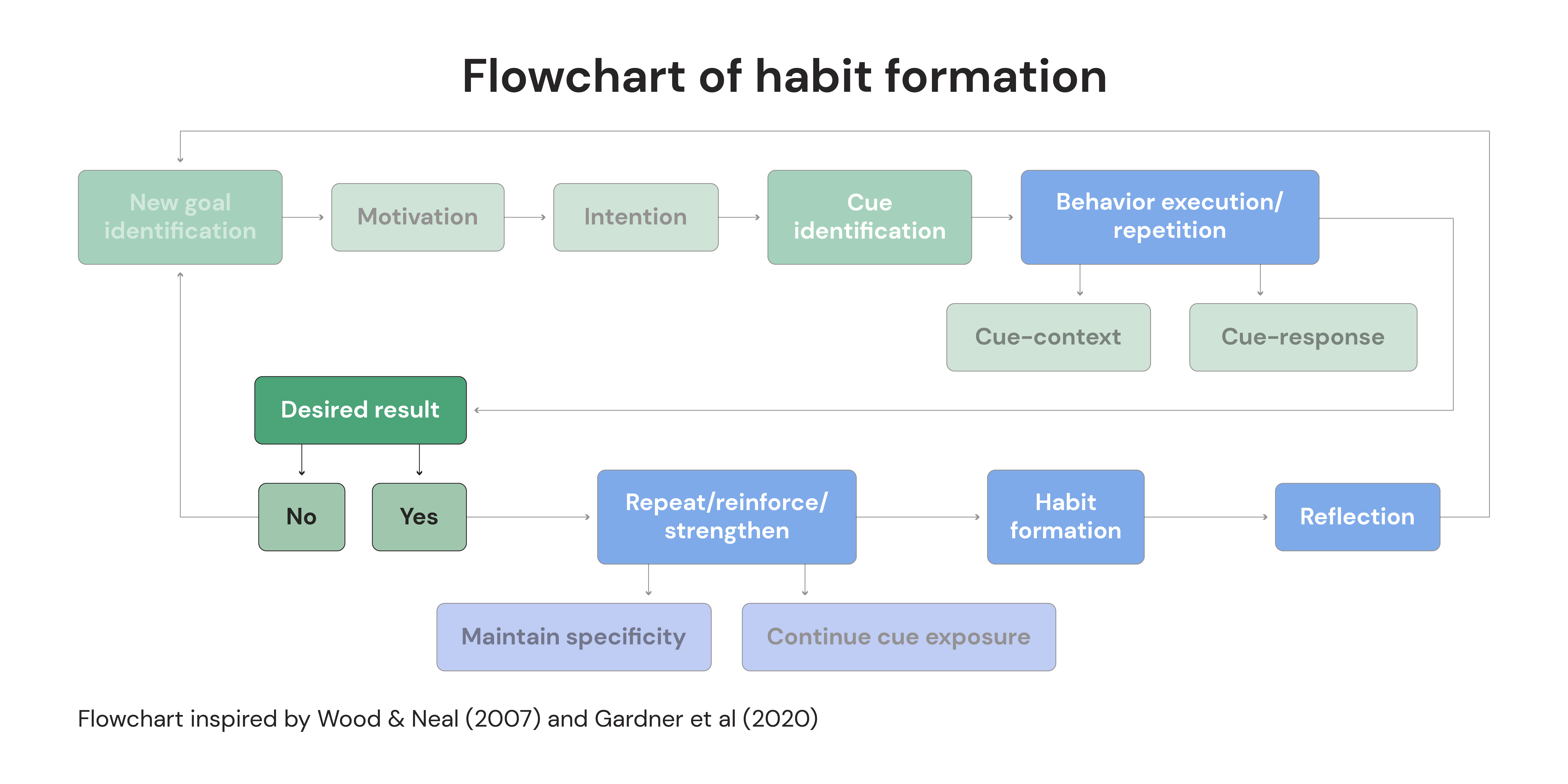 Let’s start by reviewing a detailed process loop (below) that guides you from setting a goal to the formation of a habit. This loop stands out as one of the most specific and research-backed flowcharts on habit formation. We have all the players here: Wood, Gardner, Lally, and Verplanken are the who’s who of habit research.