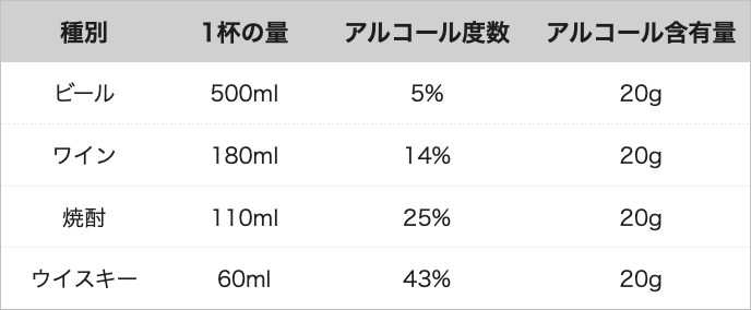 同じ種類のお酒でも、ブランドによってアルコール含有量は大きく変わることがあります。例えば、ビールのアルコール度数は4.7%だったり9.8%だったりします。ビール1杯でアルコールは20g以上になることもあり得ます。