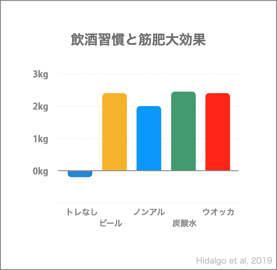 結果を見ると、被験者は全員体脂肪が減りながら、除脂肪体重が増えており、お酒による悪影響は確認されませんでした。除脂肪体重の変化は大きなものではありませんでしたが、1日1〜2杯のビールを飲みながらでも体重を保ち、筋肉を増やすことができたのだと考えると興味深い成果です。この程度の飲酒量なら、それほど悪影響はなさそうだと考える材料になります。